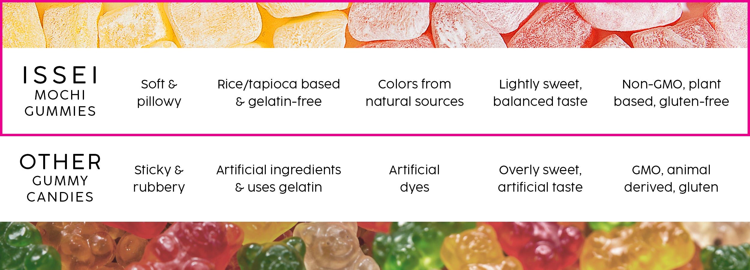 Inspired by centuries-old Japanese mochi, we created the world’s first mochi gummy — a softer, cleaner, more natural candy.